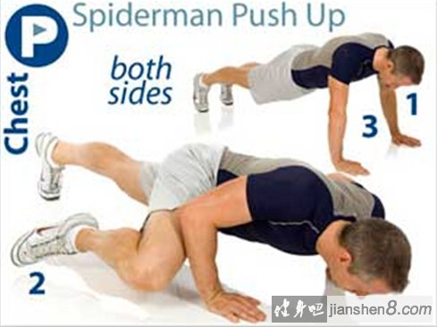 蜘蛛人俯卧撑(Spiderman press-ups)”。我们都知道俯卧撑是最简单也是最经典的力量训练动作,俯卧撑的种类变化太多了。都各有奇效,今天我们来看一个很酷的俯卧撑训练动作——蜘蛛侠式俯卧撑。去过你从小梦想着像超级英雄一样,那先来学着蜘蛛侠让自己变得强健吧! 一般我们做的俯卧撑都是锻炼胸部,肩部和手臂的,蜘蛛人俯卧撑主要锻炼的是腹部。这就是蜘蛛人俯卧撑的意义所在。通过加入变化,而这个细微的变化主要就是针对腹部的变化。对于腹斜肌来说是非常好的锻炼动作。