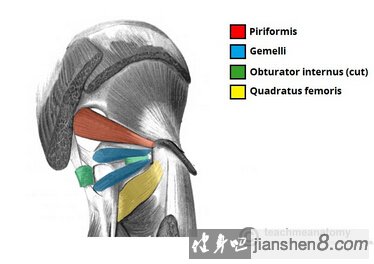 ![]() B:深层肌肉 当我们把刚刚几条浅层肌肉都翻开后,接着会看到深层肌肉。 因为这些深层小肌肉的功能类似而且常常一起工作,所以我们就把它们视为一体,简单讲几个拉伸方法就好 1.梨状肌Piriformis 2.闭孔内肌Obturator Internus 3.上孖肌/下孖肌Superior/Inferior Gemelli 4.股方肌Quadratus Femorus =>主要负责动作:1.2.3.外旋、外展 4 .外旋