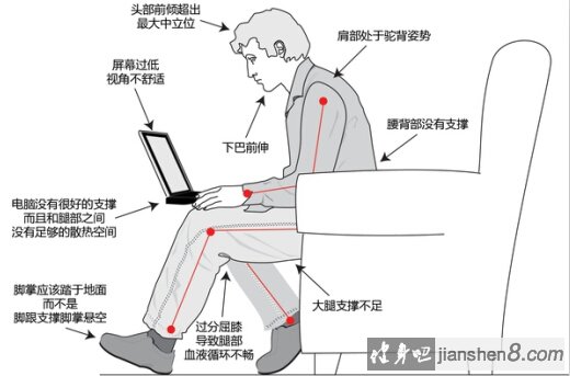 二、发生原因 那么是哪些原因造成了这种姿势异常?其中最常见的原因是由于我们长期伏案工作,导致髋部前方肌肉——髂腰肌被缩短,久而久之导致这一肌肉伸展性弹性下降,导致这一肌肉拉动骨盆向前旋转从而引发骨盆前倾。 此外,那些有啤酒肚的人,孕妇,穿高跟鞋的办公室女性经常出现这样的体态。无论是啤酒肚、鞋跟过高还是胎儿原因,由于重心前移,就会将身体拉向前方,但是正常走路时不可能弯着腰,于是会用腰的力量将身体拉回来,最后就造成了“前挺后撅”的“伪翘臀”姿态,这就导致腰肌长时间处于紧张状态引发腰肌劳损。 三、“骨盆前倾”发生率高吗 下交叉综合征在人群中发生率高不高呢?应该来说现代职业人群多数倾向于长时间坐姿工作,正如前面所说就久坐导致髋前部肌肉缩短,拉动骨盆向前转动引发下交叉综合征,另外人们普遍缺乏运动,导致背部、臀部这些肌肉松弛无力,容易说人群中出现下交叉综合征的概率还是不低的。
