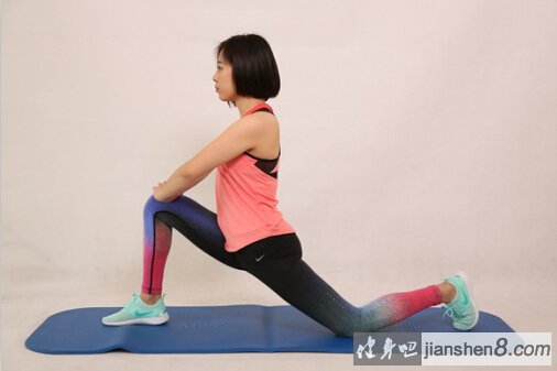 (1)髂腰肌牵拉 由于很多人长期伏案工作,导致髂腰肌缩短并造成骨盆前倾,影响了这一肌肉的伸展性和弹性,所以髂腰肌放松十分重要,对于腰部不适的人群来说,往往充分牵拉放松髂腰肌就会带来很神奇的缓解腰痛的效果。该动作采用很大的弓箭步,后腿膝盖贴于瑜伽垫上,重心前移,就能够充分感受到髋前部肌肉髂腰肌受到牵拉,保持15-30秒,可重复3-5组。