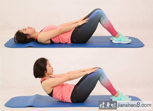 平板支撑的动作大家很熟悉,要注意保持肩髋膝踝一条直线以及不要出现塌腰、弓背等错误动作。卷腹动作,需要再强调一下,卷腹不等于仰卧起坐,卷腹只需要降身体抬至与地面成约45度就可以了。再往上走,会导致髂腰肌过度参与反而导致应该放松的髂腰肌更加紧张,另外老调重弹,不要拉头,不要过度弓背。采用如图所示手顺着大腿向膝盖摸,摸到膝盖就足矣,这时身体约与地面成45度,完全没有必要身体再向上。