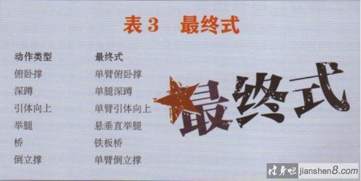 很少有人能以完美的姿势把这六个最终式都做上数次。有少数人可以做其中的一两个动作,因为很多家伙都只集中锻炼身体的某几个部位,极少有人想把全身都练得很强壮,这是人们犯的最主要的错误。正因如此,你会发现虽然有个别人能做单臂俯卧撑,但几乎没有人(除去在最难熬的监狱或精英体操训练营中待过的人)能规范地将这六个最终式都做到。只有很少一部分精英能正确掌握这六个最终式的技巧,你一定要下决心,让自己跻身其中。